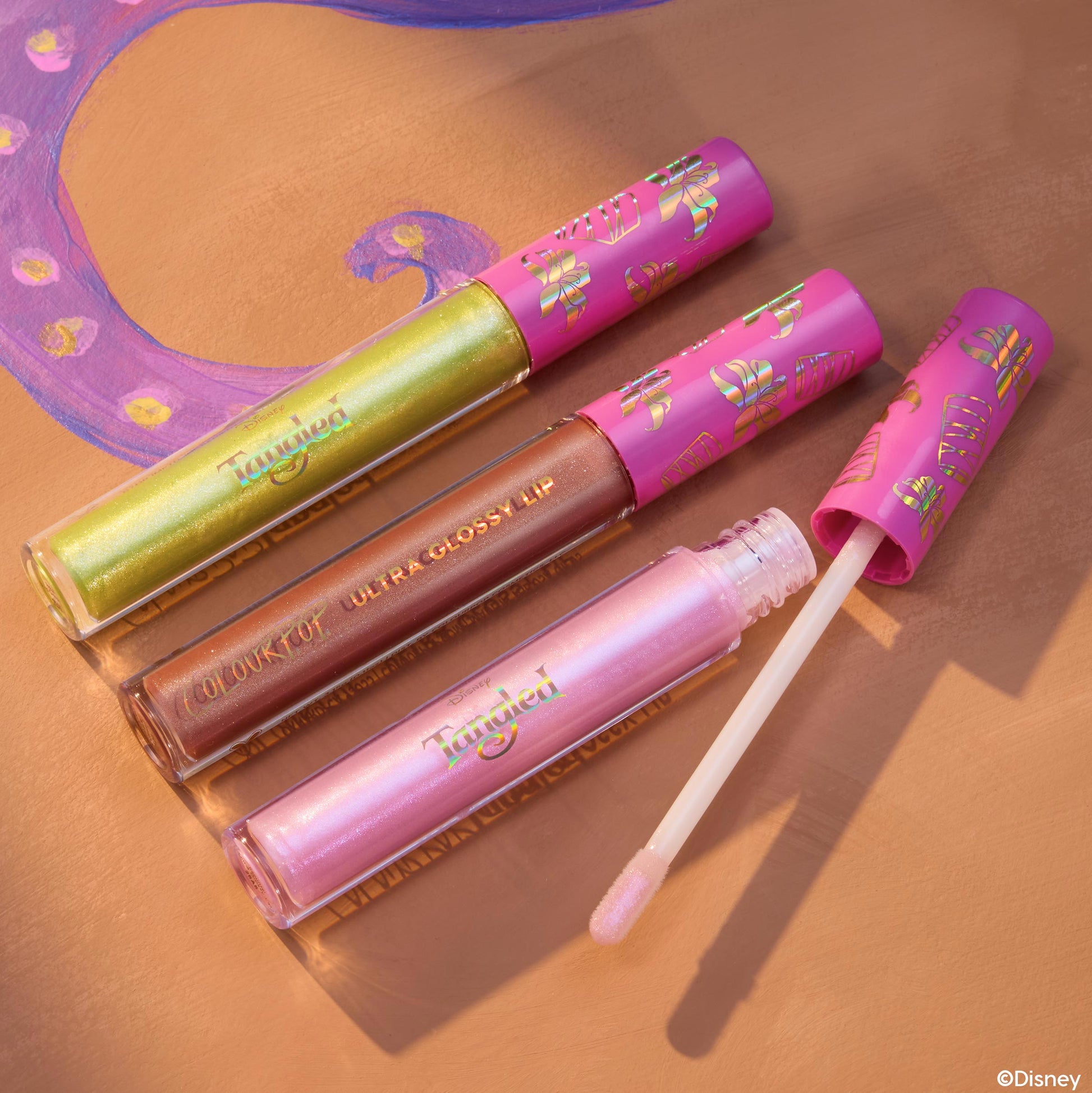 Get all 3 Disney Tangled Ultra Glossy Lip shades! Swipe on our hi-shine, smoothing (never sticky) gloss inspired by Rapunzel, Pascal & Flynn Rider and prepare to be obsessed. Infused with Hyaluronic Acid, Plum Kakadu and Sweet Cherry Oil for a nourished pout. Our flexible paddle applicator applies a perfect plush layer that looks and feels amazing. Shades Included: Rapunzel: Pearlized pinky lavender Pascal: Pearlized sheer golden lime Flynn Rider: Pearlized warm nude with silvery gold sheen